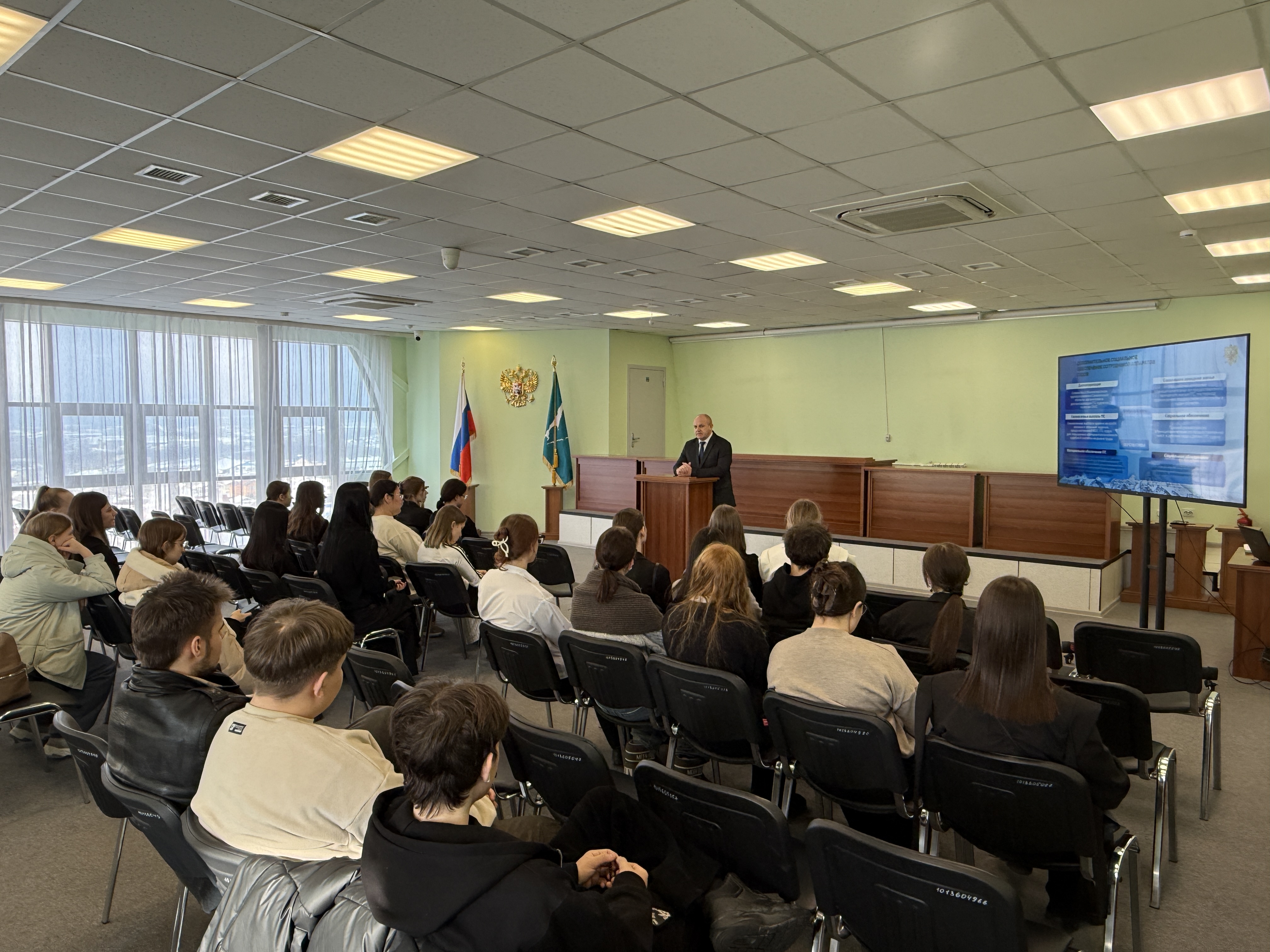 10 февраля 2026 года в Южно- Сахалинском городском суде состоялась экскурсия для студентов ГБПОУ «СПЭТ» профессионального звена, специализации «юриспруденция» 10 февраля 2026 года в Южно- Сахалинском городском суде проведена ознакомительная экскурсия для студентов 2 курса ГБПОУ «СПЭТ» Встреча началась с холла суда, где судья Южно-Сахалинского городского суда Манаева Мария Александровна рассказала ребятам о правилах пропускного режима, а также познакомили их с информационными стендами, электронным киоском и официальным сайтом суда, на которых размещаются списки дел, рассматриваемых в конкретный день. Для студентов провели обзорную экскурсию, где будущие юристы получили первые представления о работе судебной системы. Им рассказали об основных принципах и задачах работы суда, порядке и этапах проведения судебных заседаний, познакомили со структурой суда. Затем экскурсия продолжилась на втором этаже здания суда, где студентам продемонстрировали работу системы видеоконференцсвязи, рассказали о преимуществах дистанционного участия лиц в судебном заседании, не имеющих возможность личного присутствия в здании Южно-Сахалинского городского суда. Кроме того до студентов была доведена информация о возможности получения судебного извещения, копий судебных актов в электронном виде на Едином портале государственных и муниципальных услуг («Госуслуги»), а так же студенты были проинструктированы, как на («Госуслугах») настроить согласие на получение судебных уведомлений в электронном виде. Так же, учащимся предоставили возможность посетить архивные помещения, где они наглядно познакомились с условиями хранения гражданских дел. Далее студенты выступили в качестве слушателей в судебном заседание по уголовному делу под председательством судьи Гуркун Олеси Юрьевны, где смогли на реальном примере увидеть, как идет судебный процесс, какую роль в нем играет судья, государственный обвинитель, защитник, секретарь судебного заседания. В целях популяризации государственной гражданской службы и повышения эффективности механизма целевого обучения для обеспечения судов Сахалинской области квалифицированными работниками с высшим образованием, начальник отдела государственной службы, кадрового обеспечения и противодействия коррупции УСД в Сахалинской области Жомова Мария Сергеевна, рассказала студентам об условиях поступления на целевое обучение и трудоустройство в судебную систему, о требованиях, предъявляемых при поступлении на государственную гражданскую службу, о ее преимуществах и возможности профессиональной реализации. Кроме того, студенты проинформированы о возможностях прохождения производственной практики в суде и о перспективах служебного роста. В завершение экскурсии с напутственными словами выступил председатель Южно-Сахалинского городского суда Колосов Владимир Иванович, пожелав учащимся успехов в учебе, сделать правильный выбор и встать на ту дорогу, которая поможет освоить любимую и нужную профессию.