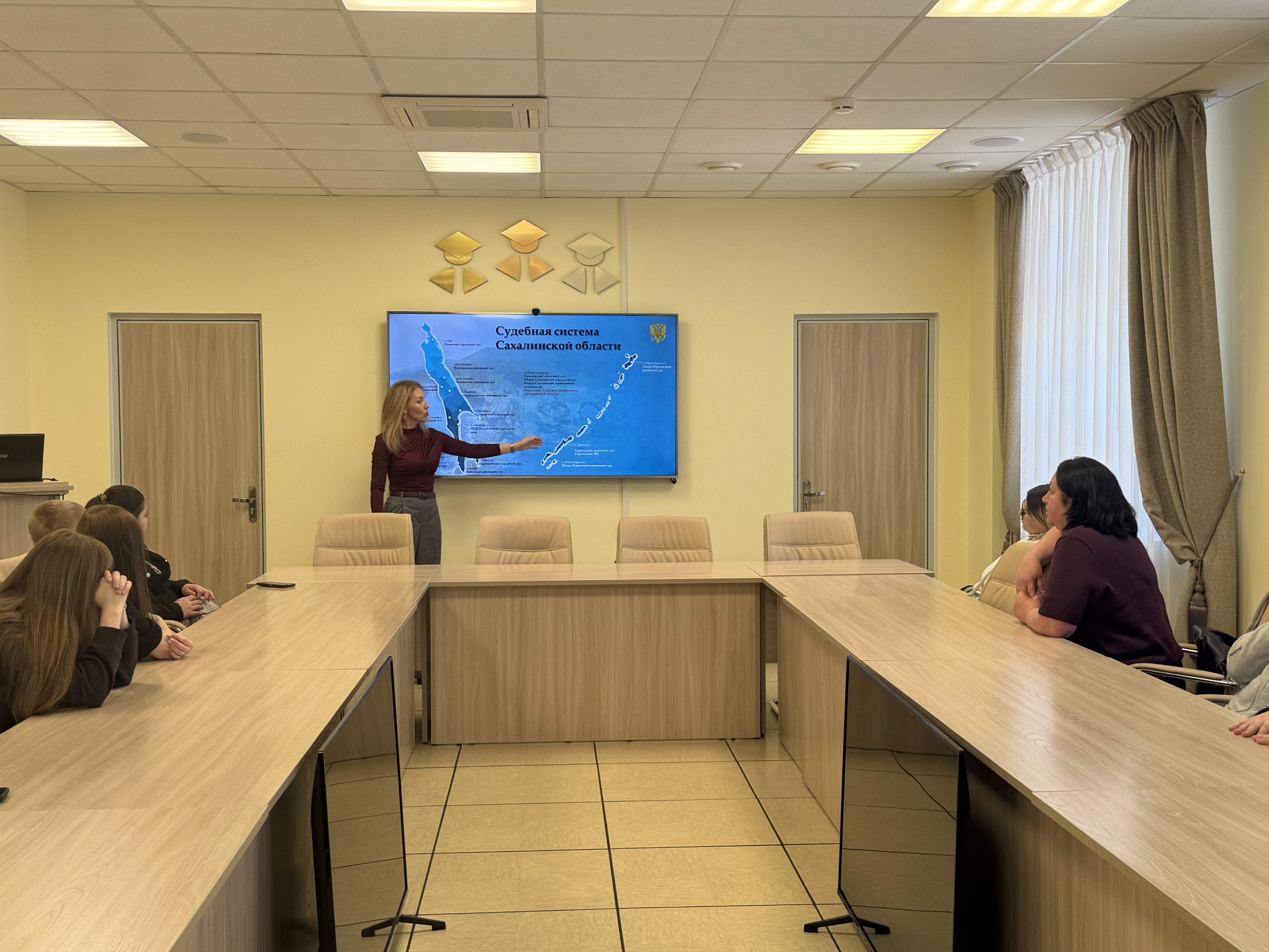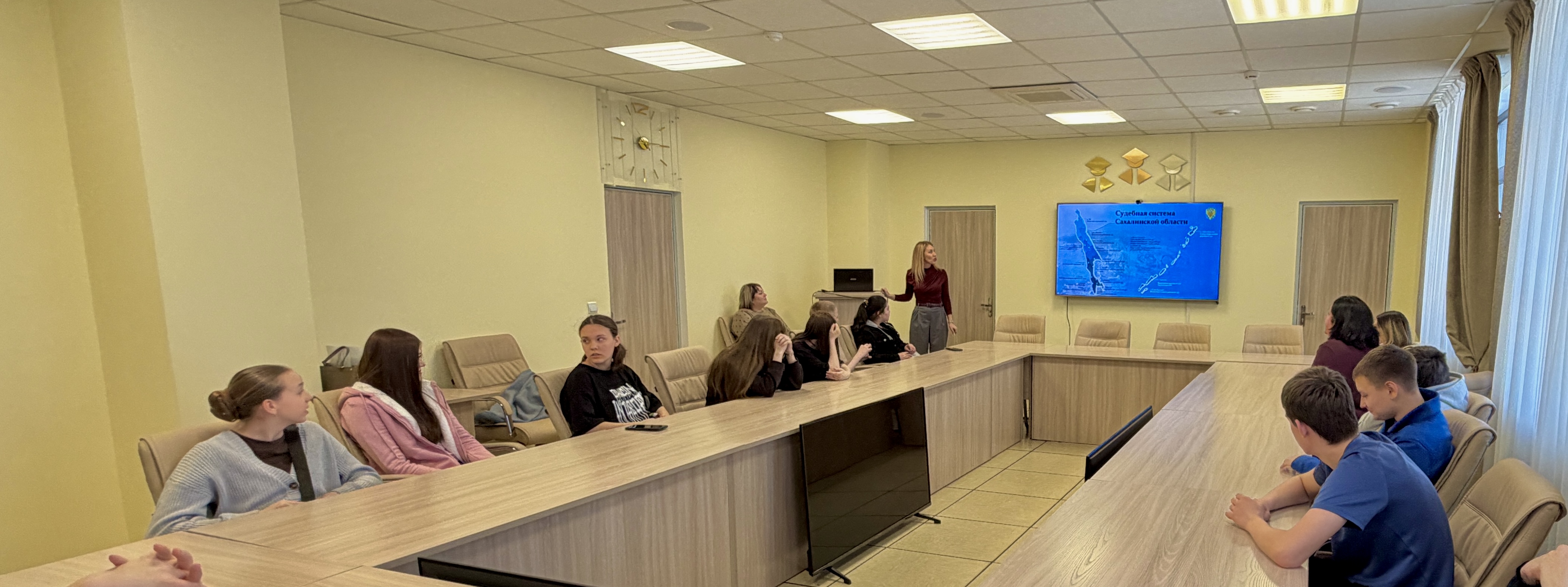 В Южно- Сахалинском городском суде проведена экскурсия для учеников 7В класса МАОУ СОШ №3 им. Героя России Сергея Ромашина г. Южно- Сахалинска. 20 марта 2026 года в Южно- Сахалинском городском суде проведена ознакомительная экскурсия для учеников 7В класса МАОУ СОШ №3 им. Героя России Сергея Ромашина г. Южно- Сахалинска. Ребята в сопровождении своего руководителя совершили экскурсию по зданию суда. В холле здания суда школьников познакомили с режимом работы поста судебных приставов по осуществлению пропуска граждан, рассказали им о правилах поведения в здании суда и специальных средствах обеспечения правопорядка. Судья Южно-Сахалинского городского суда по уголовным делам Шаула А.С. рассказал ребятам об истории суда, ознакомил их с положениями российского законодательства. Рассказал о принципах справедливого и демократического судопроизводства, о судебной системе, ознакомил их со структурой суда, деятельностью судей, рассказал о полномочиях судьи, о значимости и престижности данной профессии. Во время беседы с учащимися, были приведены примеры рассмотренных уголовных дел, совершенных подростками. Также присутствующим были озвучены отдельные нормы уголовного законодательства, содержащие виды ответственности и размеры наказания за различные преступления. Подросткам рассказали о недопустимости употребления наркотических средств и о последствиях, которые могут причинить вред не только здоровью, но и жизни. Ребятам напомнили, что в нашей стране уголовная и административная ответственность наступают в шестнадцатилетнем возрасте. Однако есть ряд статей Уголовного Кодекса Российской Федерации, по которым установлен пониженный возраст ответственности. Затем экскурсия продолжилась на втором этаже здания суда, где студентам продемонстрировали работу системы видеоконференцсвязи, рассказали о преимуществах дистанционного участия лиц в судебном заседании, не имеющих возможность личного присутствия в здании Южно-Сахалинского городского суда. Кроме того до студентов была доведена информация о возможности получения судебного извещения, копий судебных актов в электронном виде на Едином портале государственных и муниципальных услуг («Госуслуги»), а так же студенты были проинструктированы, как на («Госуслугах») настроить согласие на получение судебных уведомлений в электронном виде. Так же, учащимся предоставили возможность посетить архивные помещения, где они наглядно познакомились с условиями хранения гражданских дел. Далее с презентацией выступила начальник отдела государственной службы, кадрового обеспечения и противодействия коррупции УСД в Сахалинской области Жомова Мария Сергеевна, которая подробно разъяснила порядок поступления на государственную гражданскую службу и возможности профессиональной реализации в судебной системе. Чтобы предотвратить рост подростковой преступности, сотрудники Южно-Сахалинского городского суда регулярно проводят просветительские мероприятия со школьниками и студентами города. Целью подобных мероприятий является взаимодействие суда с образовательными учреждениями, формирование у учащихся правосознания, позитивного отношения к российской судебной системе.